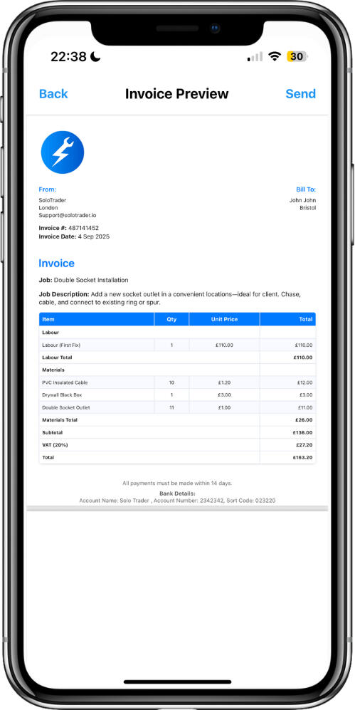 Ellie The Electrician has quickly become a standout voice in the trades community. On Instagram and Facebook she shares hands-on project snippets, practical tips, and day-in-the-life updates that spotlight craftsmanship with a down-to-earth vibe.Ellie's friendly, practical, and no-nonsense approach made her a natural partner for SoloTrader, the admin app built for one-man bands in the trades.In her day-to-day, Ellie uses SoloTrader to turn enquiries into booked work and clean invoices. Quotes go out fast, schedules stay tight, and customer comms sit neatly alongside the job, which means fewer missed messages and more repeat business.It’s a partnership built on the same promise she gives her audience: work smarter, look professional, and keep the power (and the profits) in your hands.