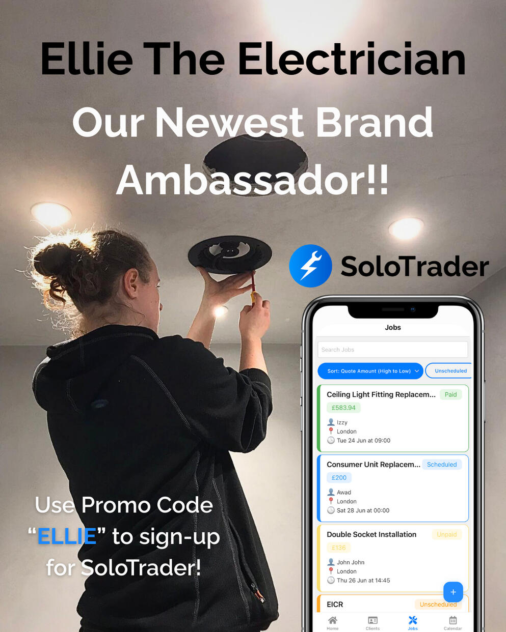 Ellie The Electrician has quickly become a standout voice in the trades community. On Instagram and Facebook she shares hands-on project snippets, practical tips, and day-in-the-life updates that spotlight craftsmanship with a down-to-earth vibe.Ellie's friendly, practical, and no-nonsense approach made her a natural partner for SoloTrader, the admin app built for one-man bands in the trades.In her day-to-day, Ellie uses SoloTrader to turn enquiries into booked work and clean invoices. Quotes go out fast, schedules stay tight, and customer comms sit neatly alongside the job, which means fewer missed messages and more repeat business.It’s a partnership built on the same promise she gives her audience: work smarter, look professional, and keep the power (and the profits) in your hands.